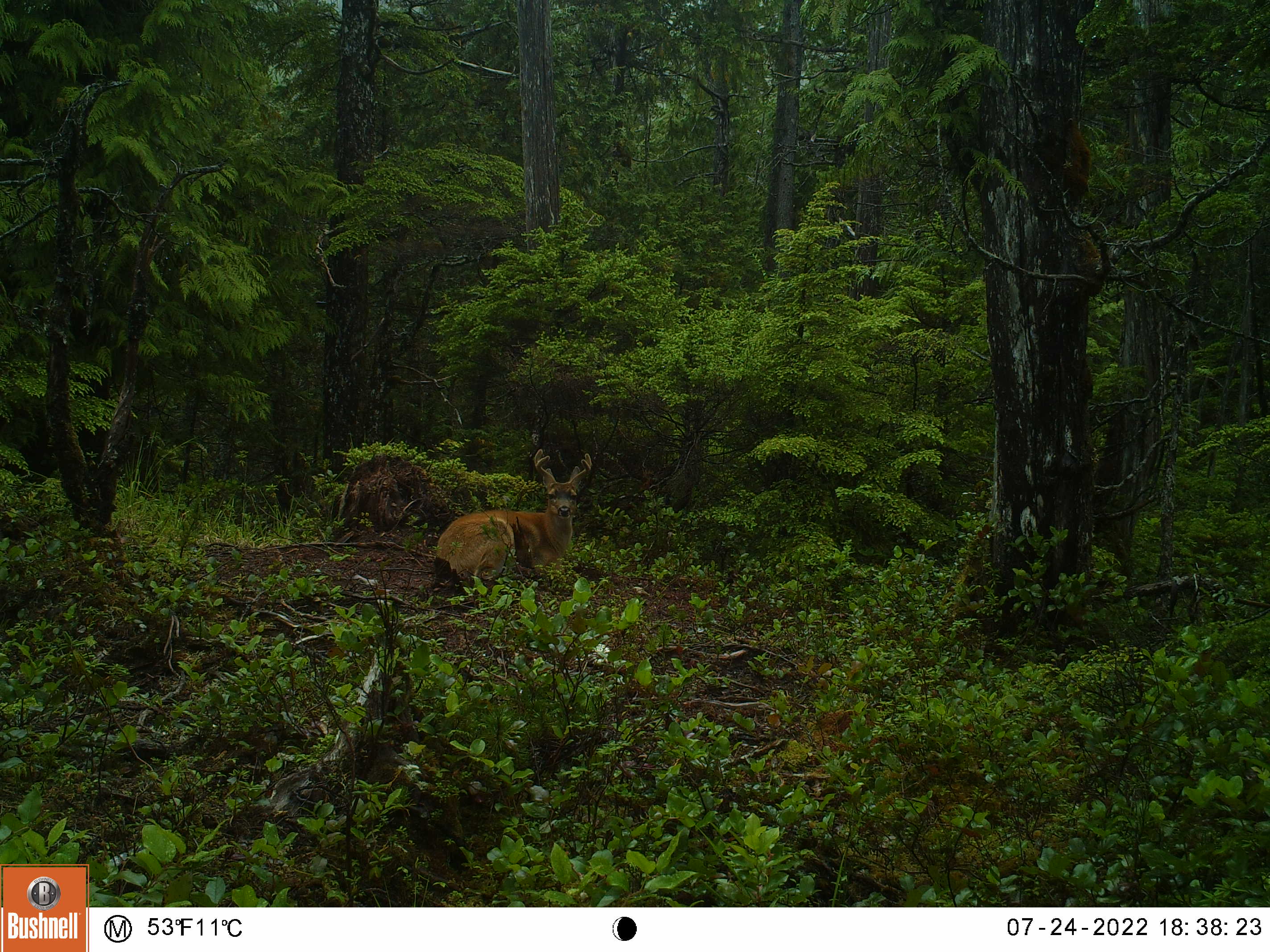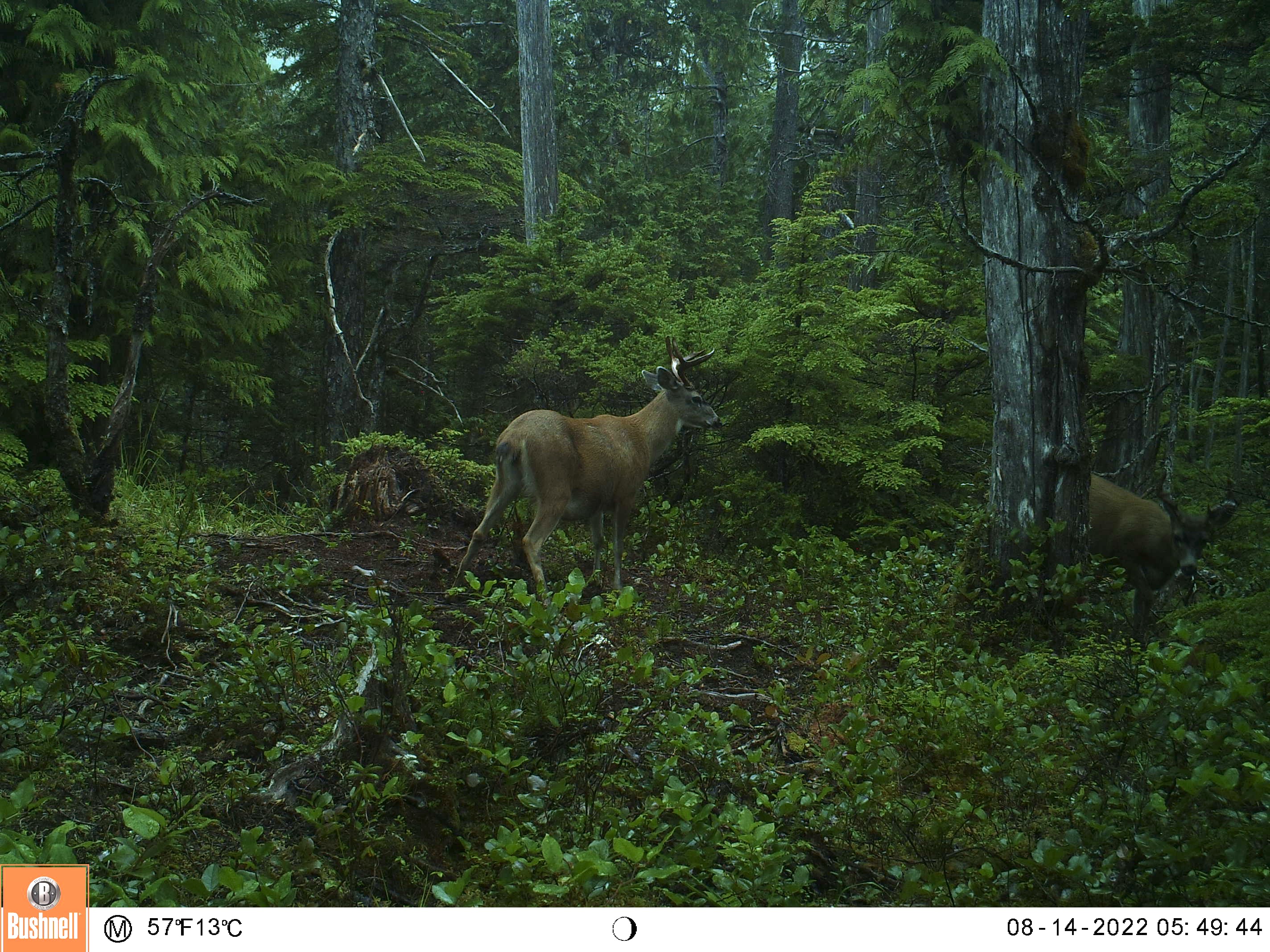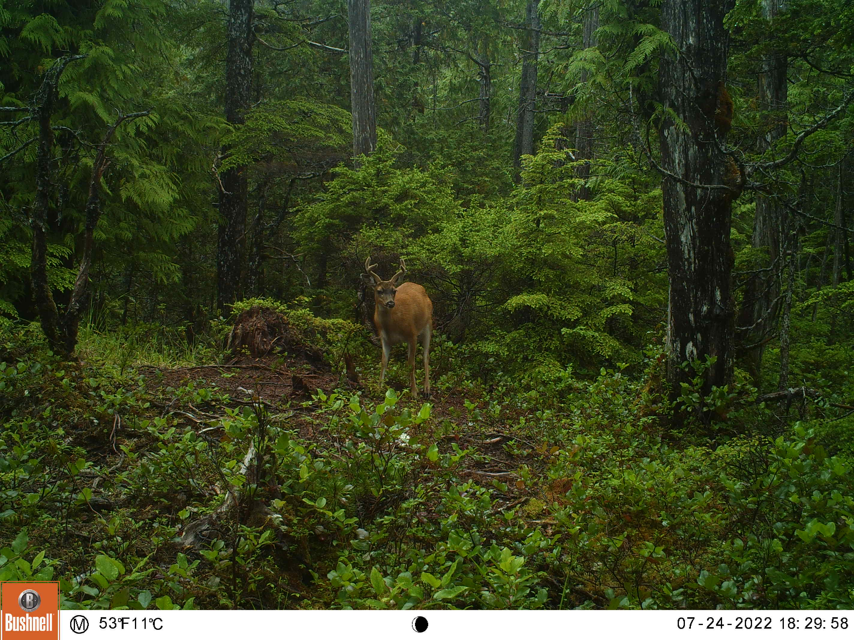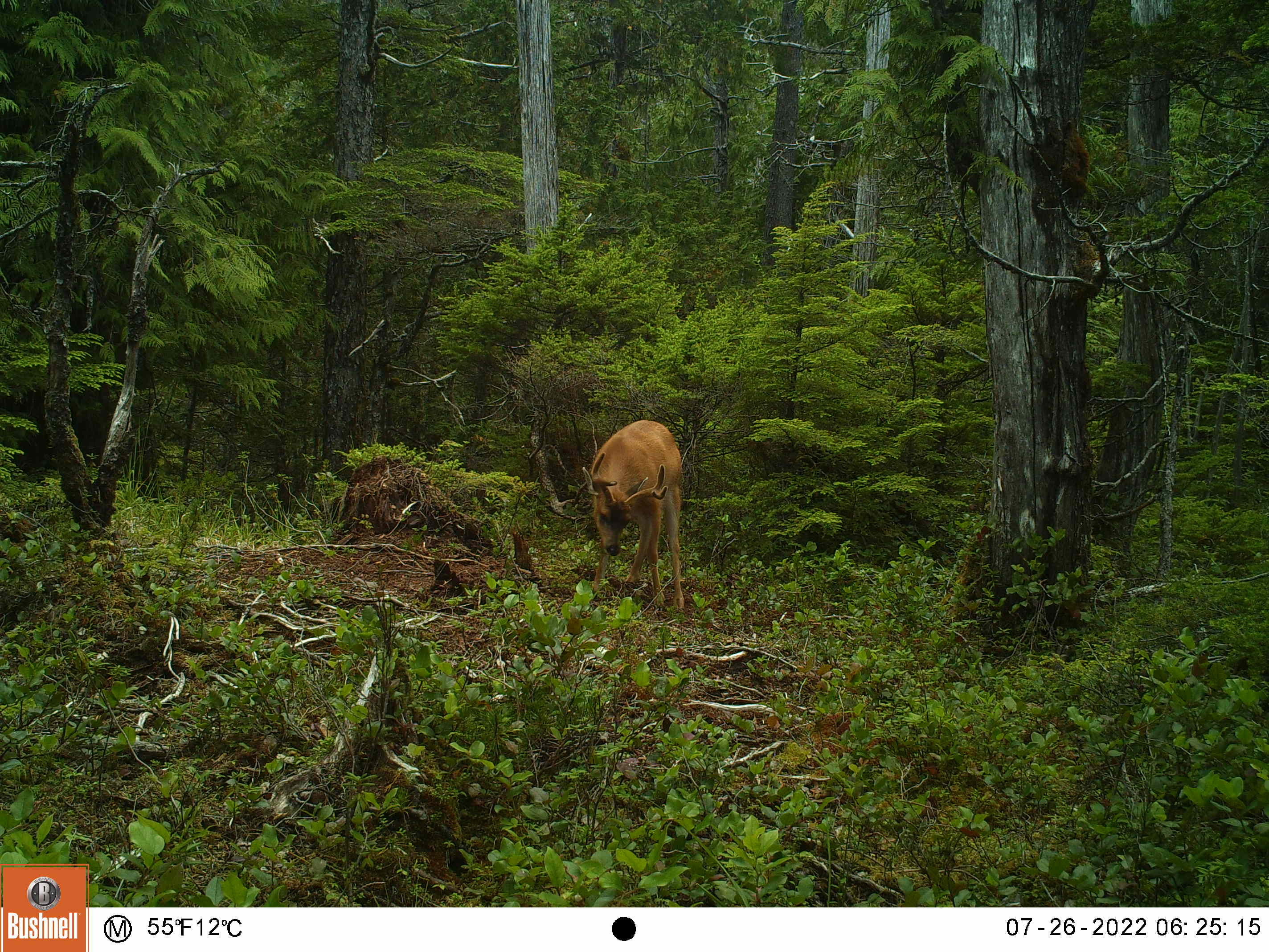 This is one of my oldest camera locations, it’s always a good place for sparring matches and it’s located in a field of skunk cabbage that is the size of several football fields, and Sitka Blacktails love skunk cabbage.