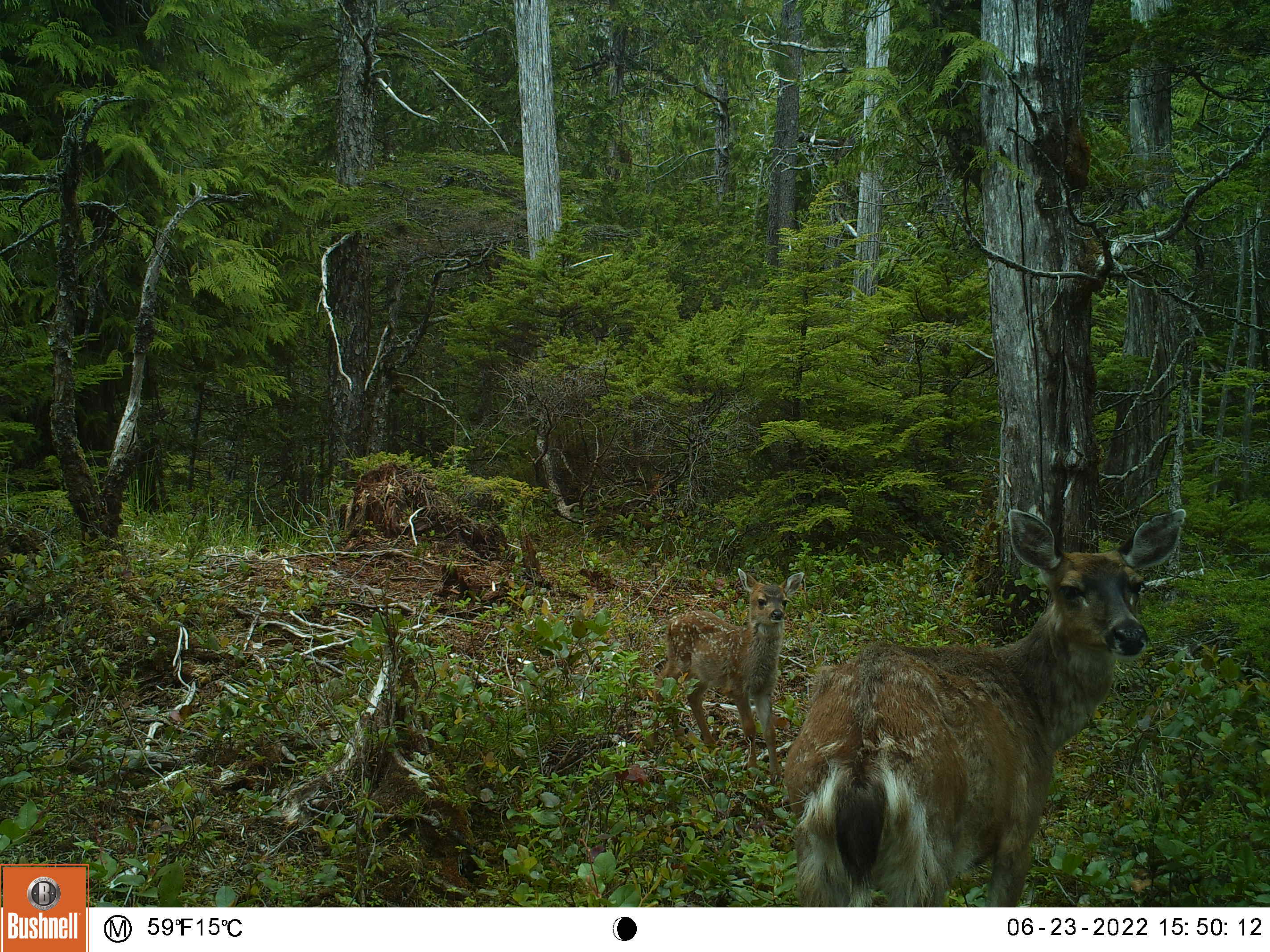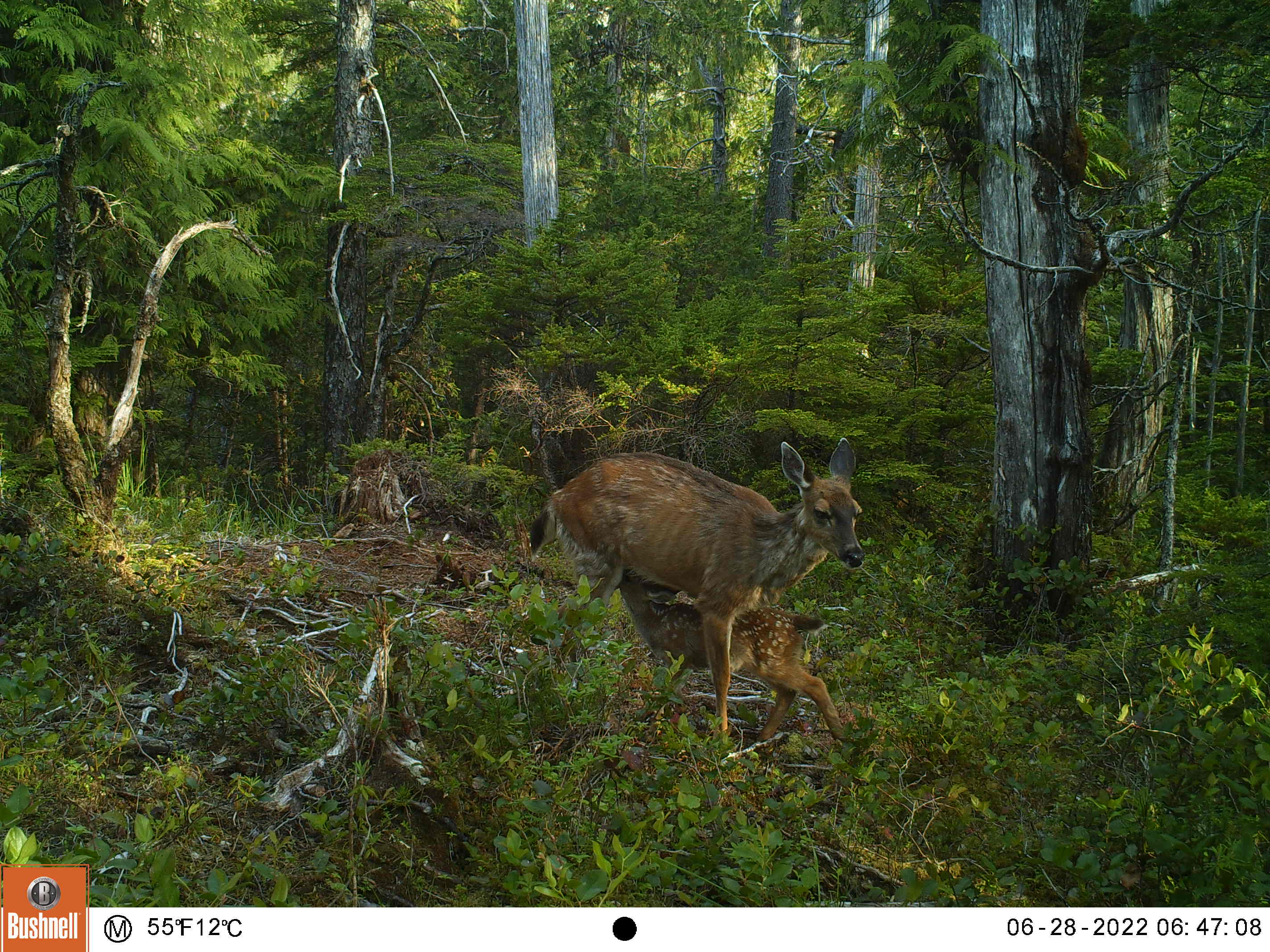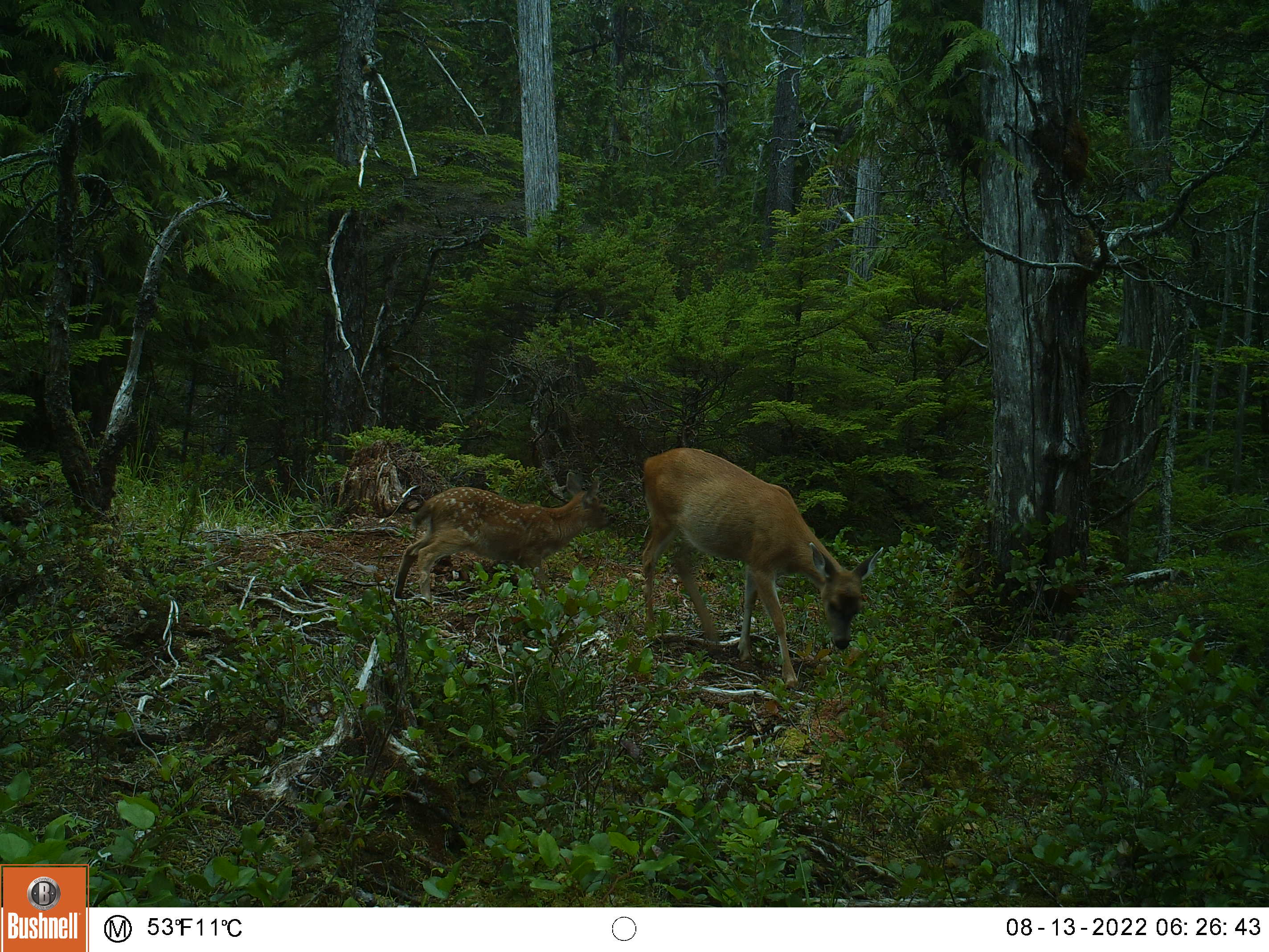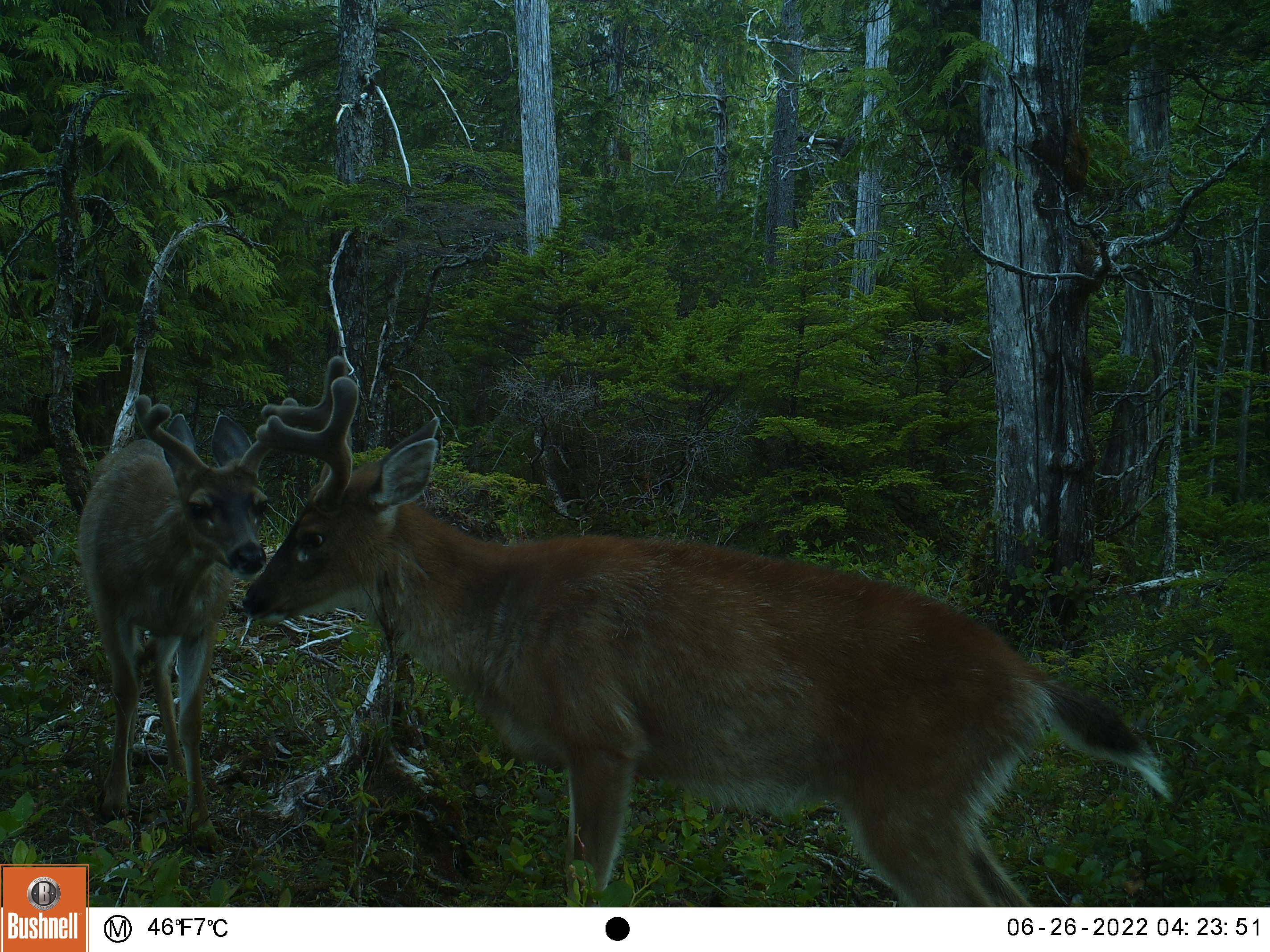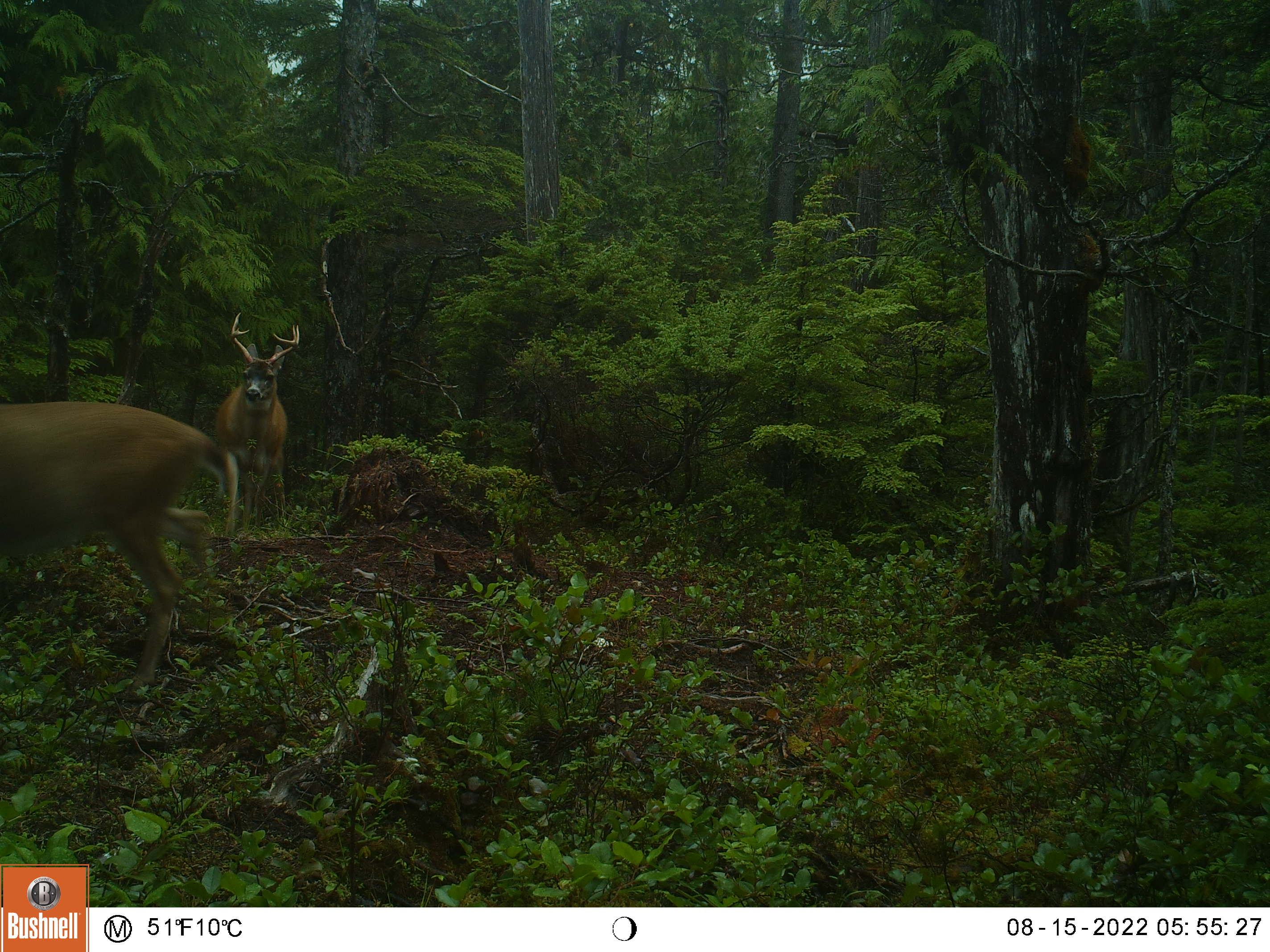 This is one of my oldest camera locations, it’s always a good place for sparring matches and it’s located in a field of skunk cabbage that is the size of several football fields, and Sitka Blacktails love skunk cabbage.